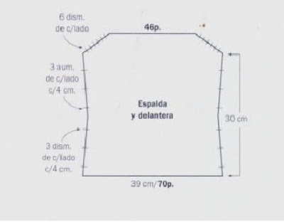 Luego aumentamos 1p.de cada lado (2 p que toman el mismo punto de la hilera anterior a 1p.de cada borde)cada 4 cm ,3 veces, quedan nuevamente 70 p.