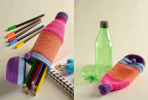 Idea genial para hacer esta cartuchera con una botella plastica y restos de hilo/lana de otros trabajos. Solamente necesitamos medios puntos, aumentos y disminuciones para ir cubriendo nuestra botella (dividida) para poder abrir y cerrar nuestra cartuchera.